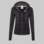 J-America Ladies 7.0 Ounce Zen Full Zip Hoody. 7.0 ounce 55/45% cotton/polyester burnout fabric. Acid washed with silicone finish. Antique brass concealed zipper. Flatlock stitching details throughout. Dyed to match drawcords. Extra long cuff length.